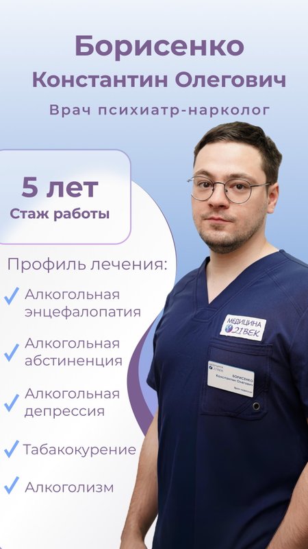 Прошло уже где-то 8 месяцев после лечения в Медицина 21 век. Алкоголь больше не управляет моей жизнью, теперь ценю свое здоровье и семью. Врачи в клинике настоящие профессионалы, всегда поддерживали, Борисенко Олег прекрасный специалист и человек! Лечение было комплексным, в целом было комфортно там находиться. Спасибо всем